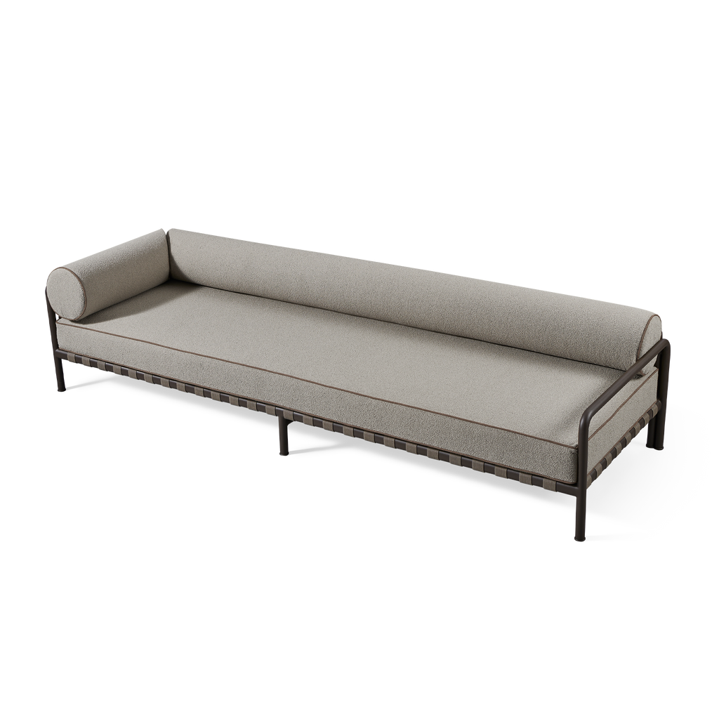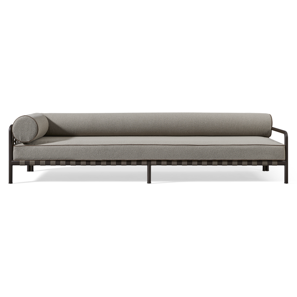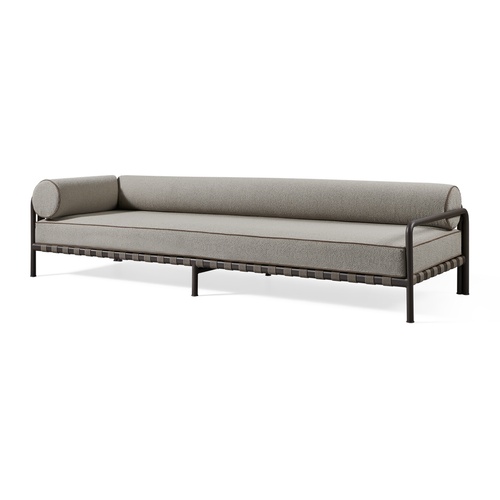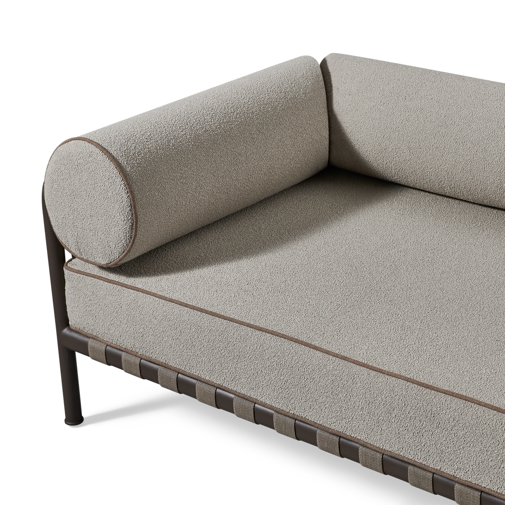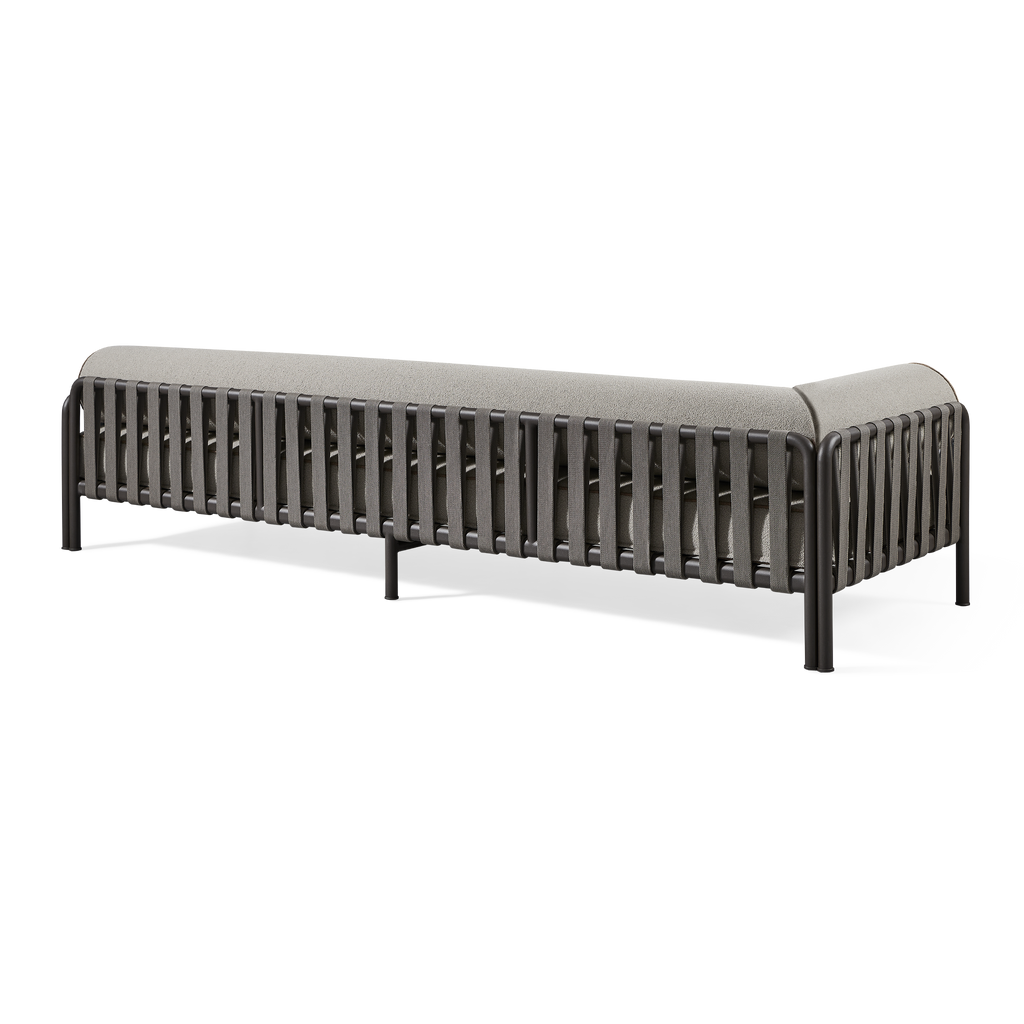 Tubular bronze aluminum, thick strapping and refined piping effortlessly update mid–century charm with contemporary sophistication for any outdoor space. The Parker Return Right is a bold design statement—enjoy a comfort–driven bench cushion and bolster back, supported by a tubular metal frame and high–quality strapping woven in parallel lines in both directions for added interest as it’s spotted through the seat deck or back. Details like contrast piping and a subtle shape placed at the foot complete this design–forward low seating collection. A gorgeous and intricately crafted piece, this modular outdoor sofa brings a touch of tradition into modern day. Pair it with our 2 seat 1 arm sofa (of the opposite arm orientation) to create an inviting cornering sectional.